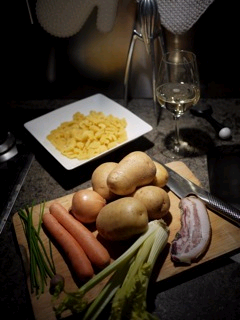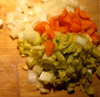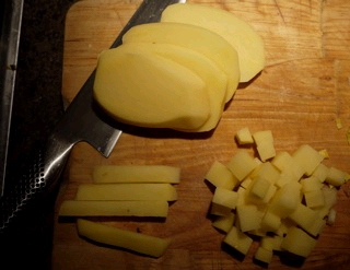 Tagliate in piccoli pezzi la carota, la cipolla, il sedano (di cui triterete finemente anche le foglie più tenere), il guanciale e, infine, le patate in quadrati regolari, non troppo piccoli, affinché la cottura non le sfarini del tutto.