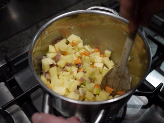 Tagliate a dadini la crosta del formaggio e unitele al composto. A questo punto aggiungete le patate e, rimescolando spesso, lasciate che si rosolino; continuate questa operazione abbastanza a lungo: le patate devono quasi attaccarsi alla pentola e prendere un bel colore dorato.