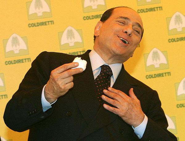 Silvietto Berlusconi mentre interpreta Que reste-t-il de nos amours ingurgitando una mozzarella (blu)