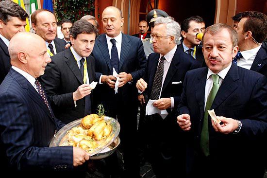L'ex governatore siciliano (ora in cella) Totò Cuffaro, detto vasa vasa, con il suo celeberrimo vassoio di cannoli.