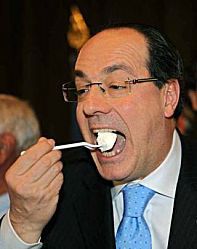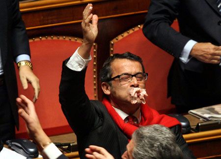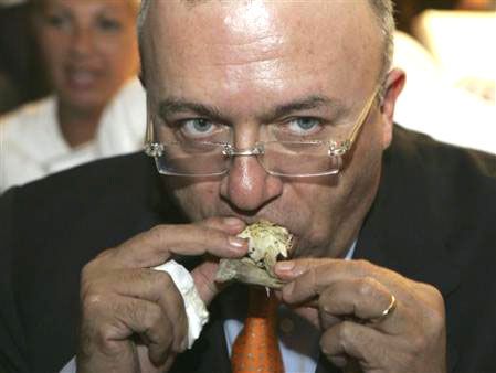 La storica mortadella nella raffinata bocca del Pdl Nino Strano, che così festeggiò, sobriamente, la caduta del governo Prodi