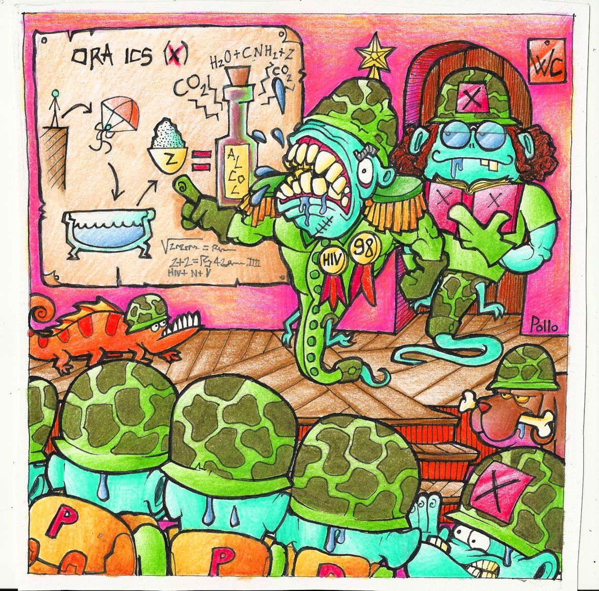 Ma che dici, il colonello non sarà troppo gasato, io 'sta storia della trasformazione non l'ho mica capita. Ma in realtà non c'è niente da capire e comunque si, il colonnello è gasatissimo, tanti anni fa era a capo di un'équipe scelta di batteri Escherichia Coli, era uno tosto, ha guidato delle incursioni spettacolari, come l'epidemia del manzo negli Stati Uniti nel '98. Ha pianificato le infezioni di Salmonella in Cina, si dice sia stato uno dei pianificatori del virus hiv. Poi un giorno, dieci dei suoi uomini migliori sono rimasti uccisi in un trattamento igienizzante a sorpresa e si è rotto qualcosa, doveva prevederlo e non se l'è mai perdonato. Dopo qualche mese è stato trasferito dai Batteri ai Virus per cercare di risvegliare il vecchio leone, ma ormai era tardi, non era più convinto. É stato trasferito qui ai Lieviti per fargli fare un ultimo periodo tranquillo, qui non c'è violenza, noi non combattiamo in realtà, ci mettiamo lì e mangiamo zucchero, mangiamo, mangiamo finché possiamo, e quello che espelliamo è alcol e anidride carbonica. Anzi, ti dirò, il nostro è anche un reparto tranquillo perché stiamo a enologia, pensa quelli che stanno nei bioreattori per fare acido citrico, un lavoraccio. Ora ti dico cosa devi fare, all'ora X verremo paracadutati all'interno della vasca di fermentazione, una cisterna piena di mosto, aperta in modo da fare circolare ossigeno, ne avrai bisogno parecchio per mangiare. Poi iniziera una cosa strana, ma non ti spaventare, inizierai a moltiplicarti, non produrrai un granchè, ma diventerai molti, si chiama fase di assestamento, colonizziamo lo spazio per poi trasformarlo. Una volta finito lo zucchero saremo destinati a morire di fame e una volta morti verremo filtrati. Occhio a non mangiare le cose sbagliate altrimenti invece di alcol espellerai sostanze che danno un pessimo odore al vino, il tuo odore di lievito dipende soprattutto da questo. Se fa troppo caldo mangeremo più in fretta, se invece la temperatura della vasca rimane bassa potremo lavorare in santa pace, considera che una considerevole quantità di calore la disperdiamo noi quando mangiamo. Sei pronto? Dai soldato! Servi la tua patria fungina!