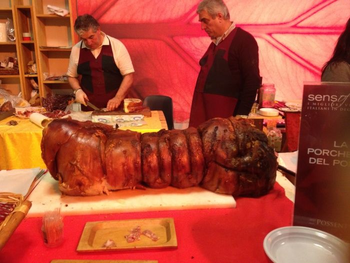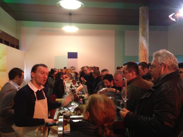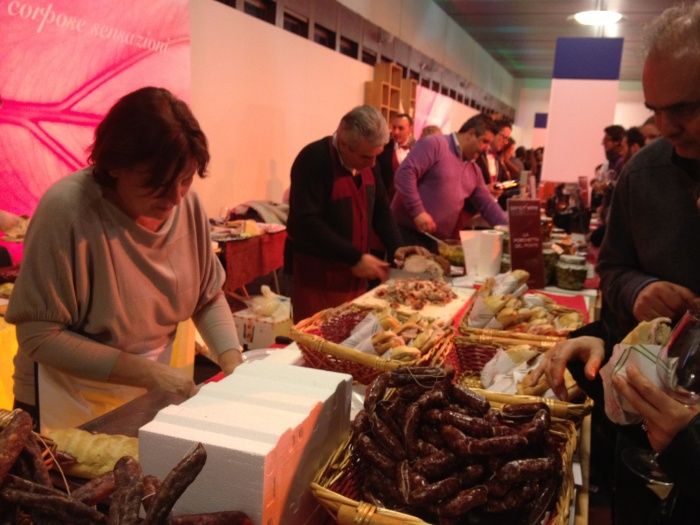 Chi ha la fortuna (?) di avere il braccialetto da privé – di quelli che attanagliano il polso in una morsa tipica di qualsiasi discoteca – può iniziare la visita con una carrellata di assaggi misti: confetti dai diametri microscopici, infinitesimi cubetti di porchetta fredda, battiti d'ali di salumi, frammenti di croccante al pistacchio e mandorle, ostie di dolci tipici, il cui sapore sembra immaginato. Si porgono bicchieri, si valuta la merce, ci si prepara all'abbuffata.