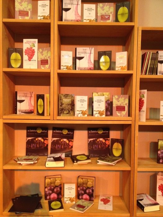 Nella terza, ed ultima, sala dal "parlare di vino" si arriva allo "scrivere di vino". Ancora qualche assaggio qua e là, una postazione radio live e scaffali e scaffali pieni di libri di Luca Maroni: Annuario dei migliori vini italiani 2012, Conoscere il vino. Per dire finalmente "me ne intendo", Il vino e il mondo intorno. Dialoghi all'ombra della vita. Avrei voluto comprarne almeno uno, dei ben 57 che ha scritto nella sua carriera, ma sono rimasta colpita dalla risposta che ho ricevuto, dallo stesso autore, sul dubbio che ci eravamo posti all'inizio della degustazione: "La Sardegna non si è presentata, perché sono lontani. Poi io sono mezzo sardo, quindi li conosco bene i sardi, evidentemente vendono bene. E poi sono più chiusi, più antichi…antichi nel senso buono del termine, io sono mezzo sardo. Il fatto è che non hanno la voglia di spen…come vi posso spiegare? In che cosa spendiamo in genere? In luce, ma lì hanno il sole fino alle dieci, in gas per il riscaldamento, ma lì il clima è talmente mite, e poi si spende in entertainment, ma lì hanno la natura, e comunque…