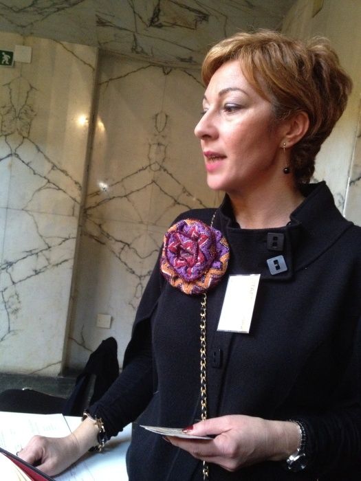 La Signora dell'evento, colei che sola poteva domare il vino e i suoi adoratori. Caronte con fiore all'occhiello per visitatori smarriti. "La Sardegna non si è presentata, non ha risposto al nostro invito, evidentemente non… ma siete sardi? Ci dispiace tantissimo (con quella sibilante così eccessivamente marcata), ma se volete vi posso consigliare."