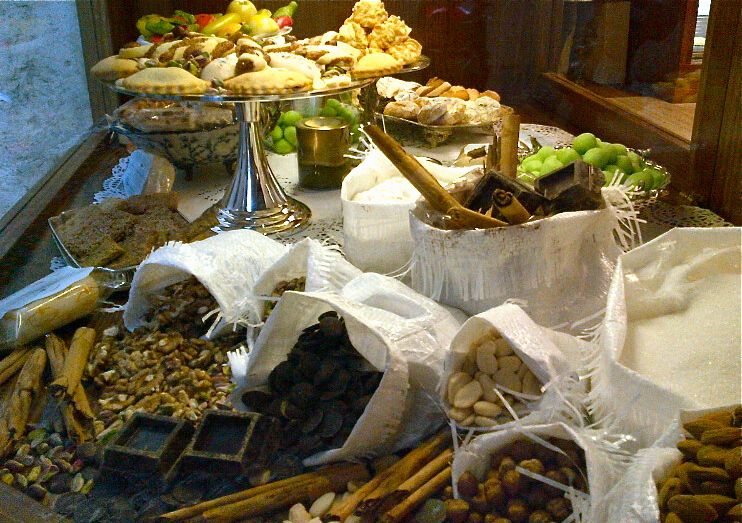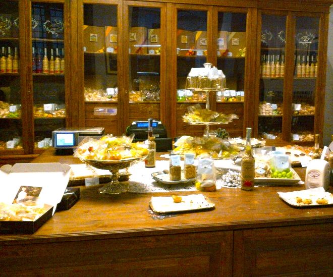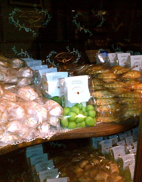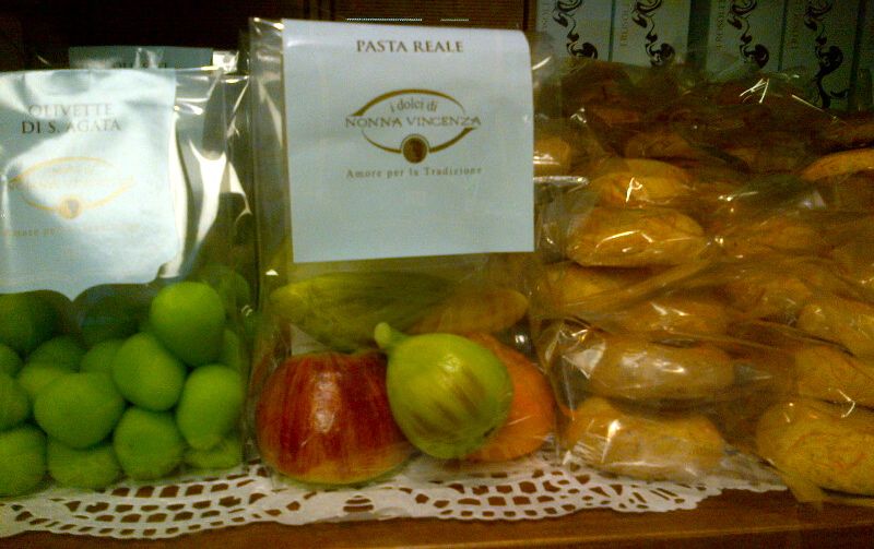 Vetrinette e scaffalature pullulanti, empie, strabordanti di paste di mandorla, olivette di Sant' Agata, marzapane dalle fattezze più disparate, croccantini di mandorle.