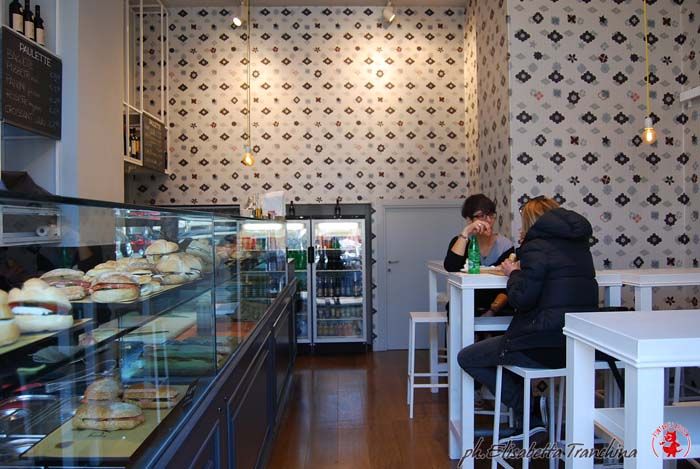 L'interno del locale. Pochi tavoli e sgabelli, un ambiente fresco e luminoso.