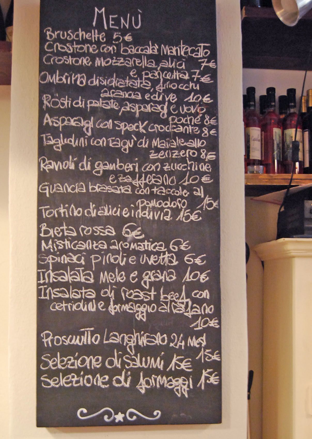 La lavagna dei vini e la saletta all'ingresso: tavoli un po' ravvicinati, ma clima caloroso