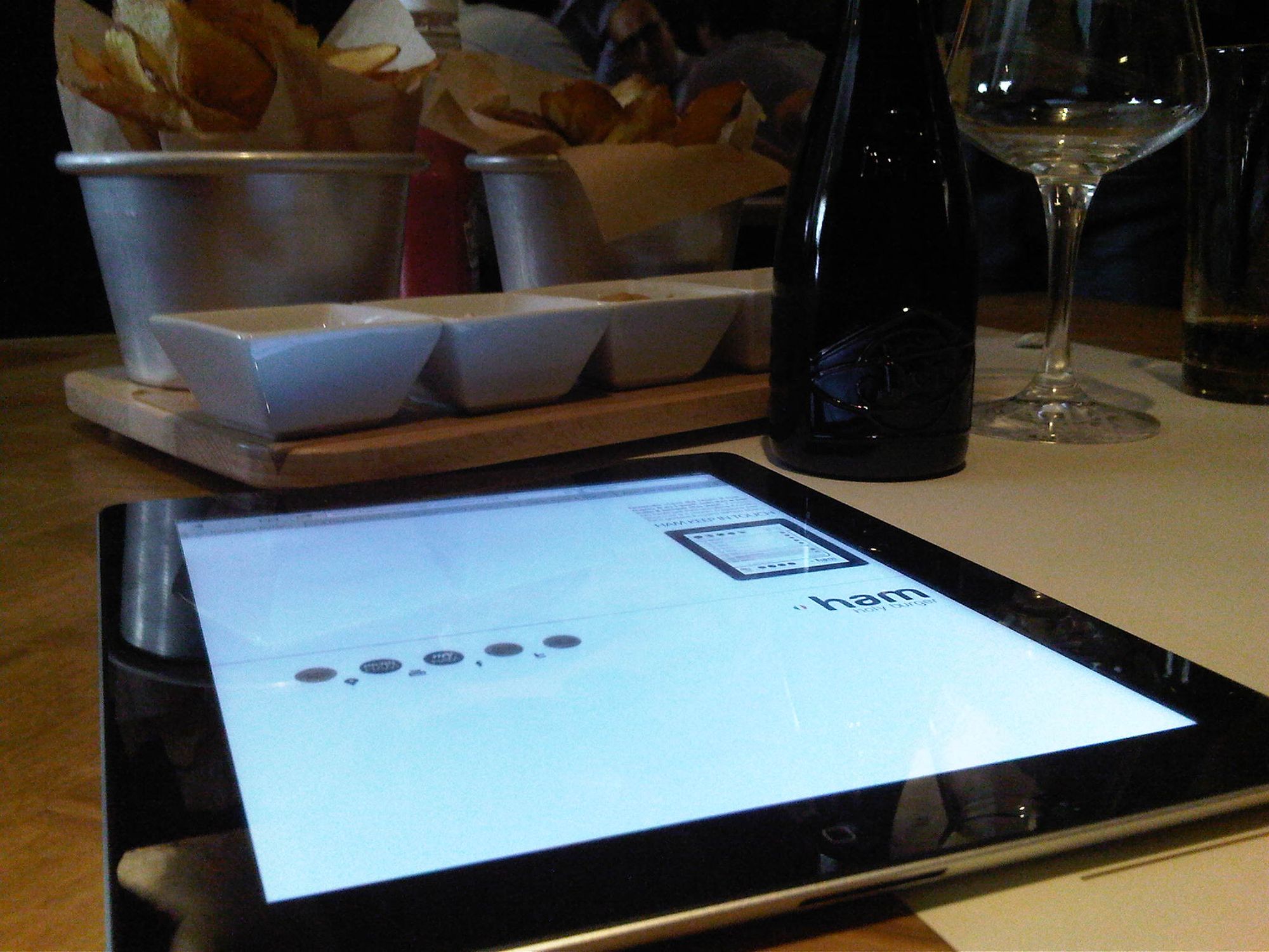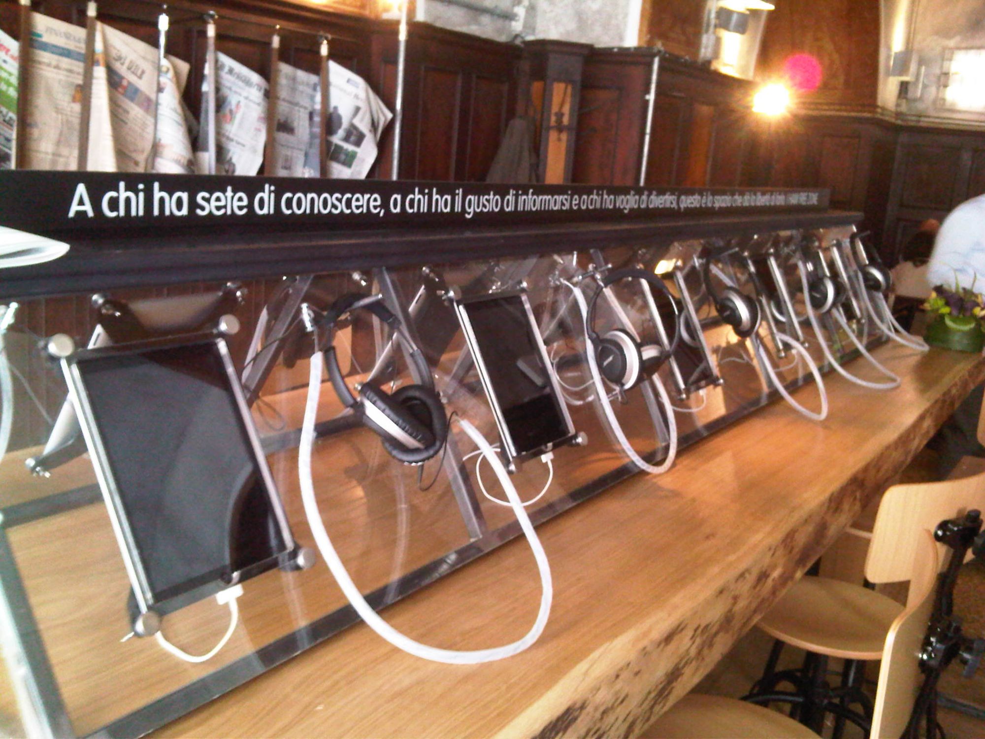 Eccolo l'Ipad: si ordina cibo e bevande e si può personalizzare, aggiungendo o togliendo gli ingrediente e scegliendo la cottura. Il primo giorno i cetrioli espunti sono puntualmente arrivati e al posto di una Open Baladin è arrivata una Menabrea. Ma è normale rodaggio. C'è anche, nella foto, una saletta con gli Ipad e i giornali a disposizione di chi li vuole utilizzare