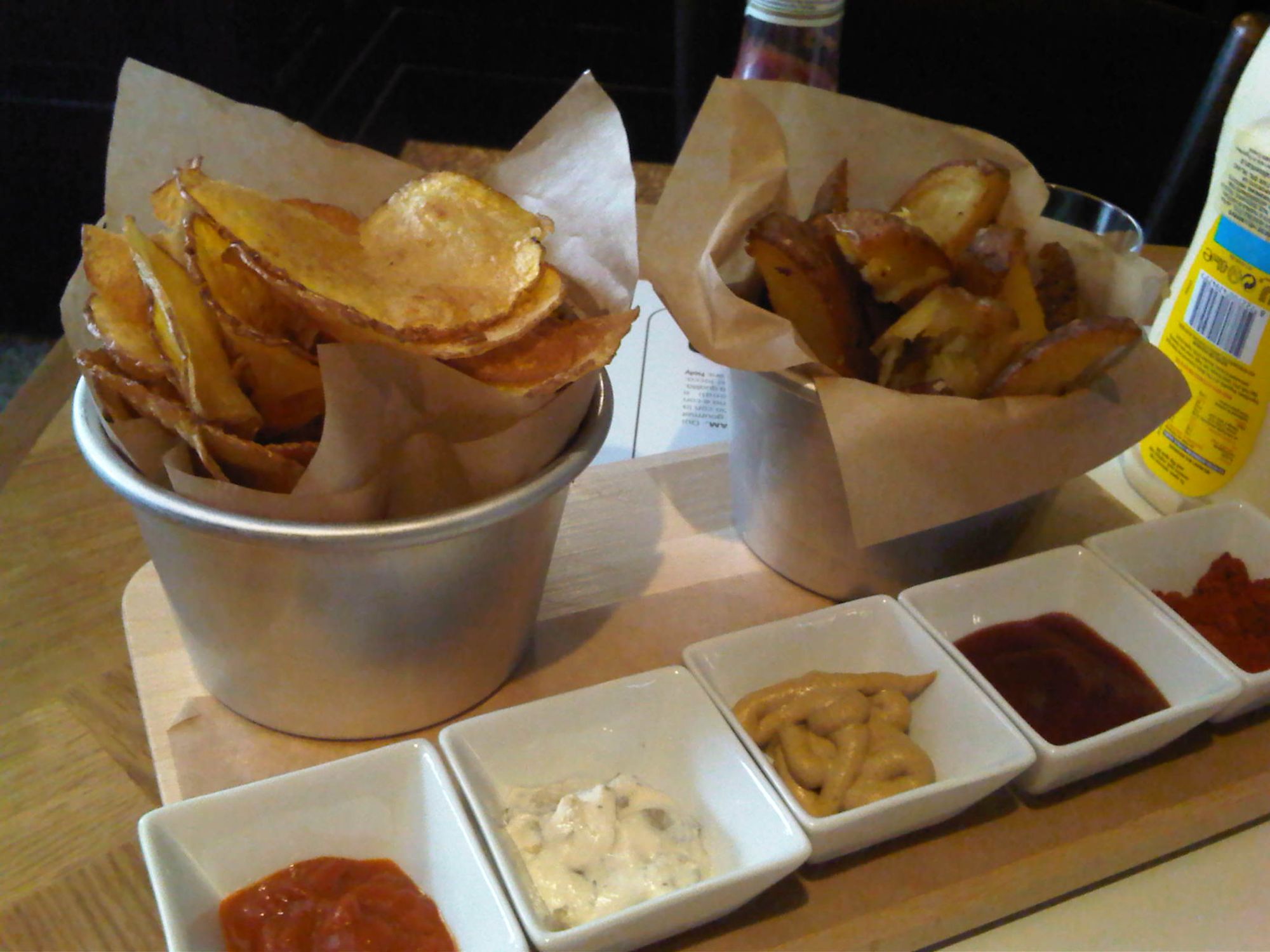Patate a sfoglia e patate a spicchi, con relativo spreco di salse: le prime sono buone ma un po' umide e molli, le seconde buone ma non troppo cotte.