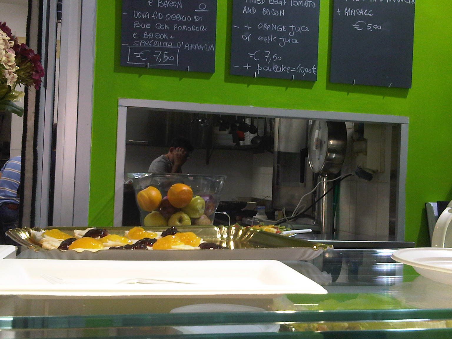 Un bel verdone alle pareti, scelto personalmente da Monica, figlia di Mr Clood, il nostro mitico cuoco che avete visto all'opera nelle videoricette di Puntarella Rossa (in fondo al post riproponiamo la cacio e pepe). Il piccolo laboratorio, casa-famiglia, di Mr Clood ha infatti subito una riverniciata e una rispolverata e ora si presenta munito di tavolini e soprattutto con una novità, tutte le mattine: l'American Breakfast. Insomma, uova in tutte le salse e in tutte le fogge, bacon, bagel, pancake e tutto quello che fa una colazione all'americana come si deve. Con il tocco trasteverino di Mr Clood, s'intende. Che non pago dell'impegno ha deciso di aprire anche la sera.