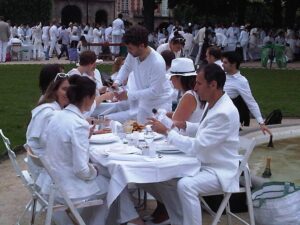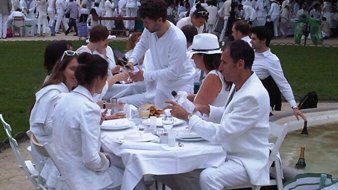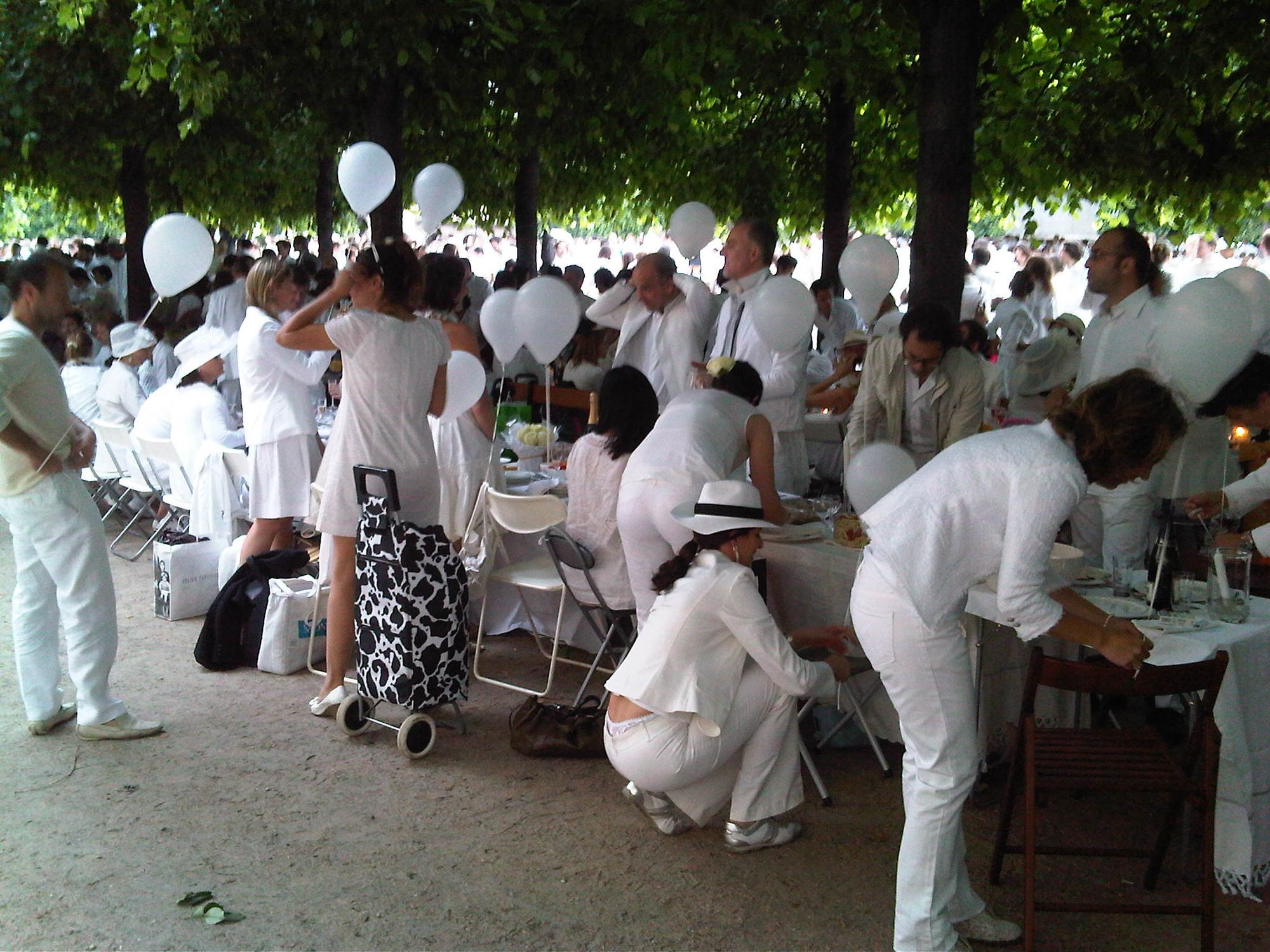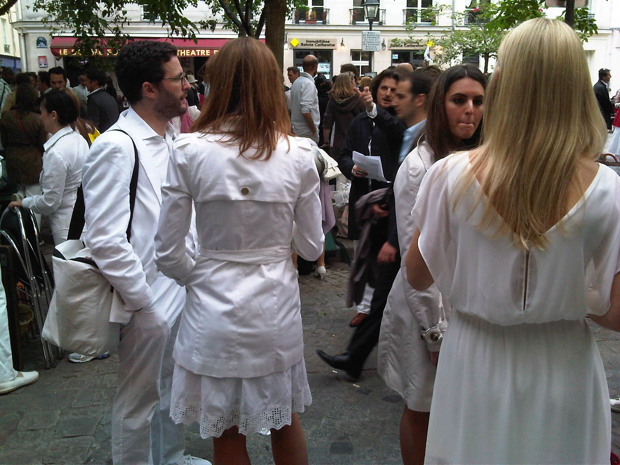 Cosa sia il diner en blanc, o white dinner, l'abbiamo raccontato. E' l'adunata sediziosa di un gruppo sempre più numeroso di giovani selezionati, della buona borghesia francese, che decide di vestirsi di bianco e piazzare tavoli e sedie in un luogo della città. Una sorta di flash mob ante litteram, inventato nel 1988 da tal François Pasquier.