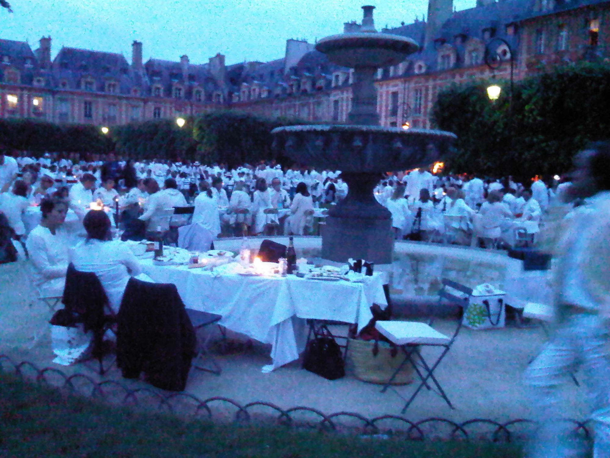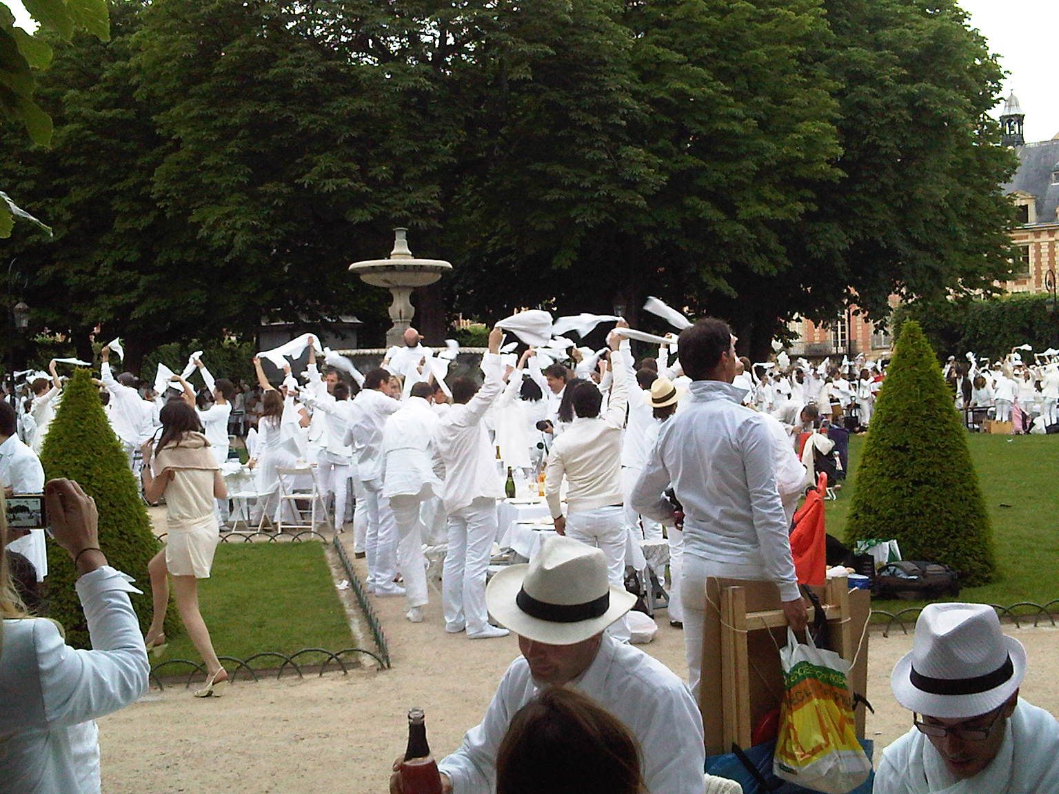 I preparativi per la cena in bianco (diner en blanc) a Parigi sono in stile anarchici informali. Per giorni si susseguono mail misteriose, zeppe di avvertimenti e inviti alla cautela."Attention à la gendarmerie". Il giorno è fissato, giovedì 14 giugno, ma l'ora x sarà comunicata solo via sms un'ora prima. E anche il luogo è segretissimo, noto solo alla cupola della cellula. Verso le 19 veniamo convocati in una piazzetta del Marais, grazioso quartiere parigino. Una piccola folla beve panachè in incognito. Ma eccoci: si parte. Gli straniti turisti di place des Vosges vedono materializzarsi all'improvviso 7.000 giovani che si sono liberati dai soprabiti scuri e sono completamente vestiti di bianco. In pochi minuti estrraggoono da sacchi e zaini i tavoli da picnic, srotolano tovaglie, estraggono Veuve Clicqot e sushi. Ed eccoli i sediziosi anarchici, che sventolano fazzoletti bianchi e urlano, felici e ubriachi anche quest'anno, al Diner en blanc, follia francese che sta prendendo piede in tutto il mondo, da New York a Kigali, da Singapore a Milano.