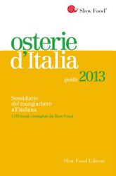 E' uscita in libreria la nuova edizione delle Osterie d'Italia, targata 2013. Il "sussidiario del mangiarbere all'italiana" – come recita il pessimo sottotitolo ("sussidiario"? "mangiarbere"?) – è una certezza da anni nel panorama delle guide, con la sua ricerca di trattorie, osterie e ristoranti nei quali il buon cibo si accompagni a un ambiente gradevole e prezzi abbordabili. Vi segnaliamo le scelte nelle città più importanti, con l'elenco delle osterie segnalate dalla guida di Carlìn Petrini (il volume è curato da Marco Bolasco e Eugenio Signoroni e contiene 1713 indirizzi). Poche le novità, che spesso non sono davvero novità e comprendono osterie già attive e note da anni: ma la guida ha i suoi tempi. Obiettivo dei curatori, la ricerca "dell'autenticità, nel rispetto del territorio".  La guida è stata presentata (indovinate dove) il primo ottobre (indovinato, da Eataly). Costo: 22 euro.