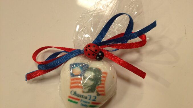 Il laboratorio in questione è quello ┬ádella pasticceria “Dolci manie”, e questa è la sua storia. Quattro anni fa Mike Rubino, un signore nato a Chicago ma da tanti anni residente in Puglia, creò il dolcetto. Lo mostrò in giro e in breve il confetto Obama divenne il simbolo della campagna elettorale del 2008, l’ “arma” con la quale l’associazione “Americans in Italy for Obama”, in collaborazione con “Apulians for Obama”, coinvolse nella campagna ┬ácirca 500mila americani, tra italiani tornati in patria dopo la pensione e americani in Italia per lavoro, con il diritto di voto.