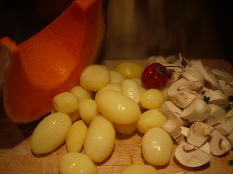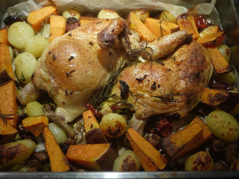 1 pollo intero; 250 g di patate novelle di piccole dimensioni; 250 g di zucca rossa; 250 g di funghi champignon; rosmarino; una testa di aglio; 70 g di burro salato;8 bacche di ginepro; sale e pepe.