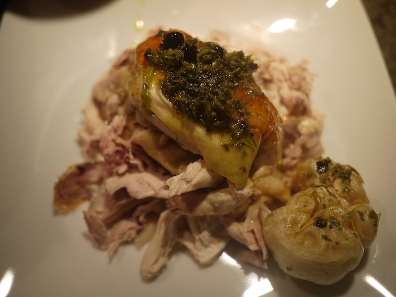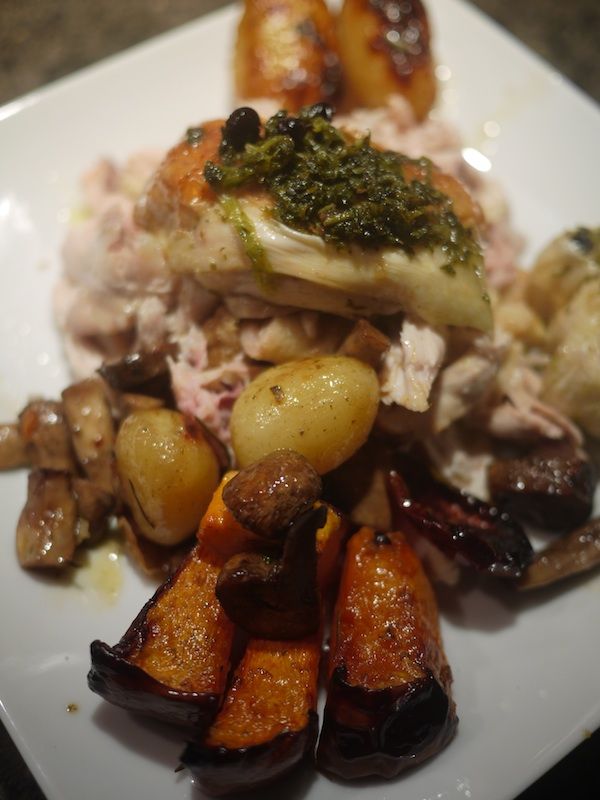 Trascorsi i 40 minuti tirate fuori il pollo e tenetelo da parte, dovrà freddare un po’ per essere infine dissossato. Rimescolate le verdure nella teglia stessa e rimettetele in forno ancora per qualche minuto.