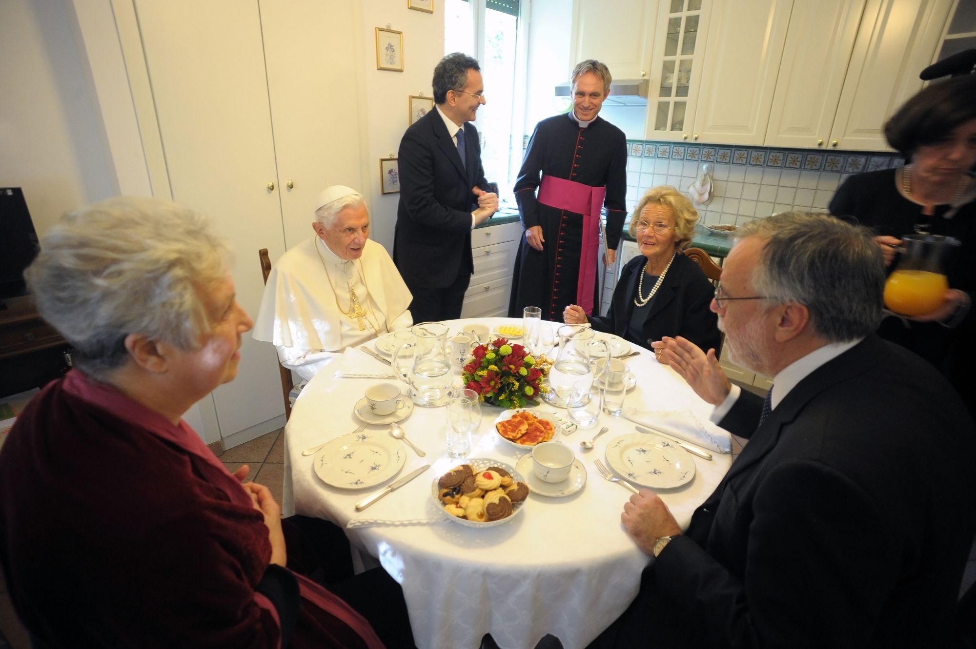 Per una policy molto stretta della comunicazione del Vaticano, è vietato ritrarre il Papa mentre si trova a tavola a mangiare. Speriamo di non incorrere in un castigo eterno. In queste belle immagini di serena convivialità, scattate velocemente e silenziosamente, sua Santità discorre amabilmente con gli altri commensali, con alle spalle il sempre bellissimo padre Georg.