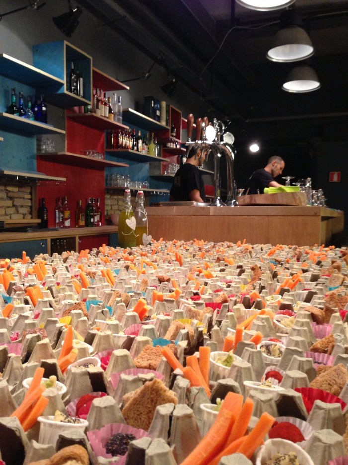 Un aperitivo-spettacolo davanti al lungo bancone del bar