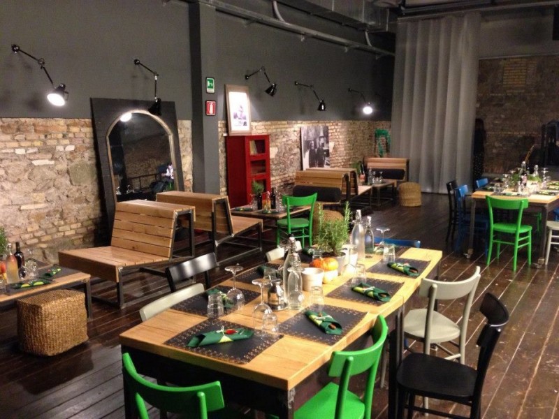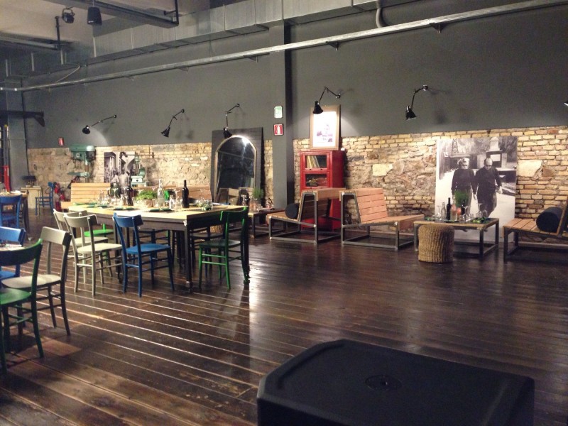 Il bellissimo pavimento di legno, le sedie colorate, il muro di mattoncini originale, fatto con materiale di risulta. Da un lato c'è il lungo bancone bar, dall'altro aree di conversazione con divanetti e tavolini.