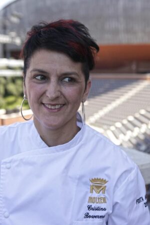 Per concludere, il passaggio finale in padella con l’olio aromatizzato con aglio e peperoncino e poi filtrato. Si saltano gli spaghetti per insaporirli prima di andare a impiattare. Come farebbe la chef, fate la cupoletta di pasta aiutandovi con un forchettone e un coppino, quindi spolverizzatela con le briciole di panettone tostate e con le sfogliette di aglio fritto e prezzemolo disidratato e polverizzato.