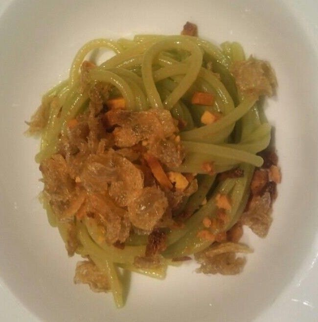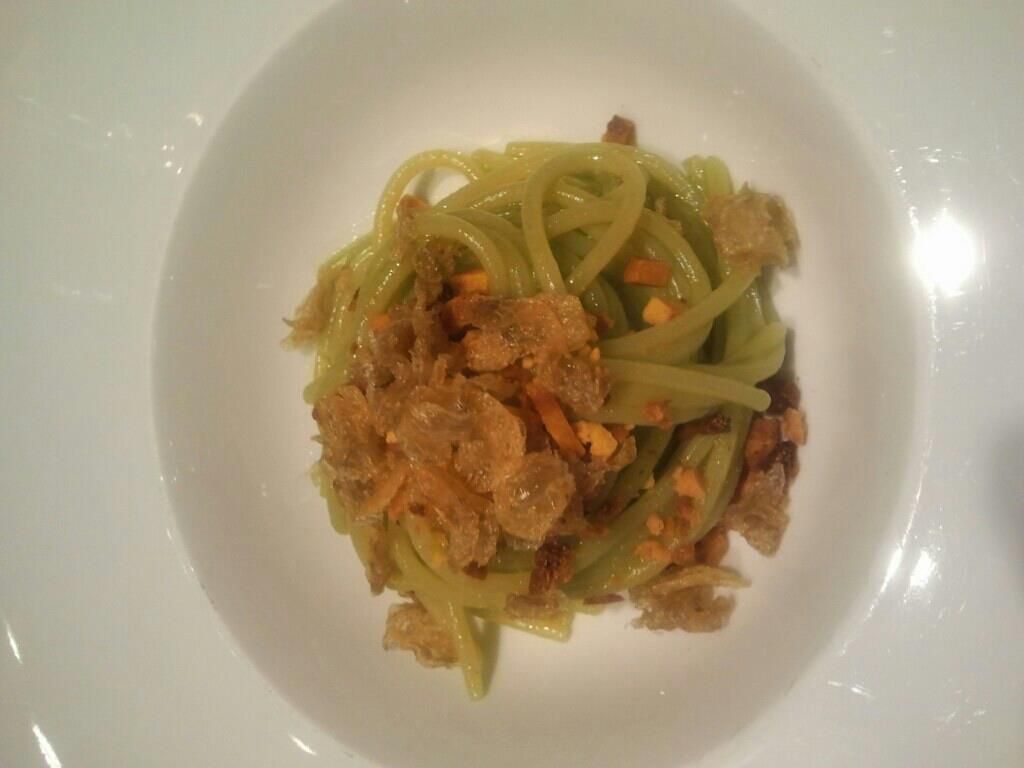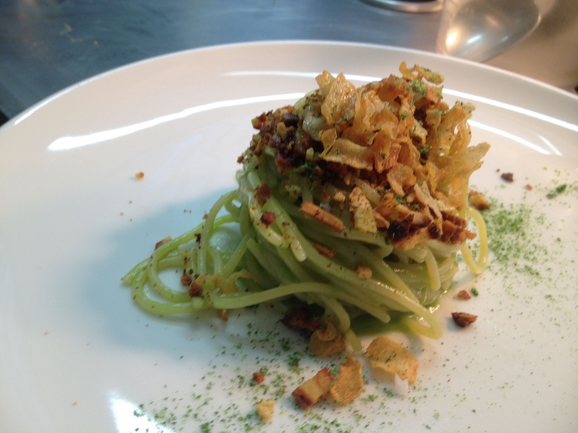 Prima di mettere a bollire la pasta, ci sono altri due passaggi intermedi da compiere, cioè la realizzazione di due condimenti fondamentali per il sapore e il colore del piatto. Da una parte la preparazione della clorofilla di prezzemolo, che serve per dare colore alla pasta (che come si vede in foto è verdastra): basta frullare abbondante prezzemolo con acqua e poi filtrare il composto trattenendone la parte liquida. Quindi si deve procedere alla sbianchitura dell’aglio, immergendolo alternativamente in acqua bollente e acqua ghiacciata per ben sette volte (per la precisione si dovrebbe cambiare l’acqua ad ogni passaggio). Gli spicchi d’aglio andranno poi tagliati a fettine sottilissime per il lungo e fritti. E vi assicuro che dopo questi passaggi il sapore forte di aglio è solo un lontano ricordo.