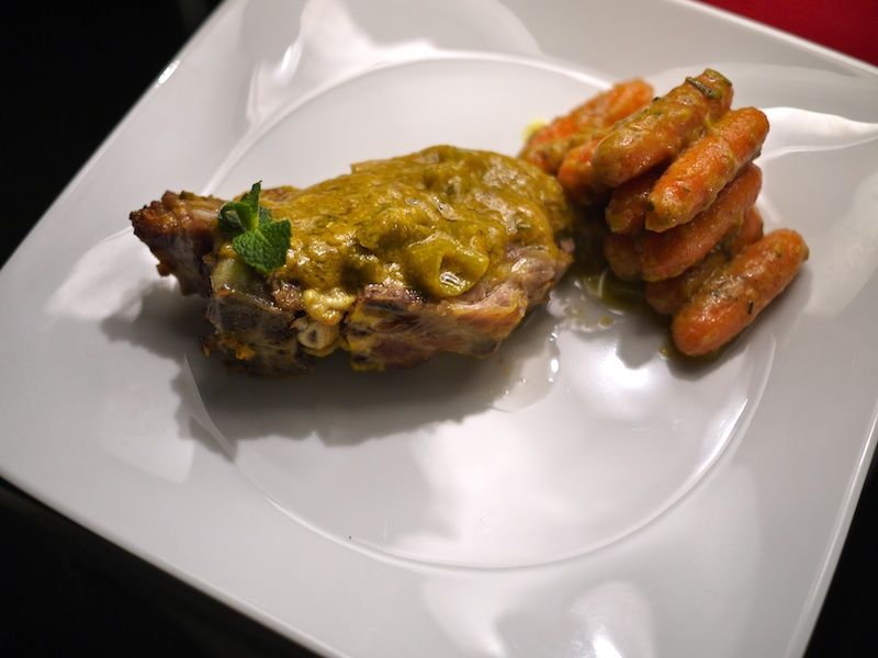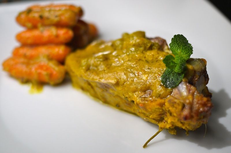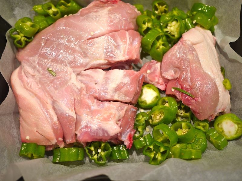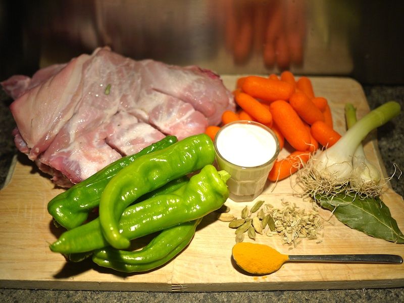 Un cosciotto di maiale; 50 g di yogurt bianco intero; 2 cipollotti; 2 foglie di alloro; 10 g di semi di finocchio; 10 g di semi di cardamomo; 50 g di zenzero fresco; un cucchiaino di curcuma; 4 peperoncini frigitelli; carote; sale; olio evo.