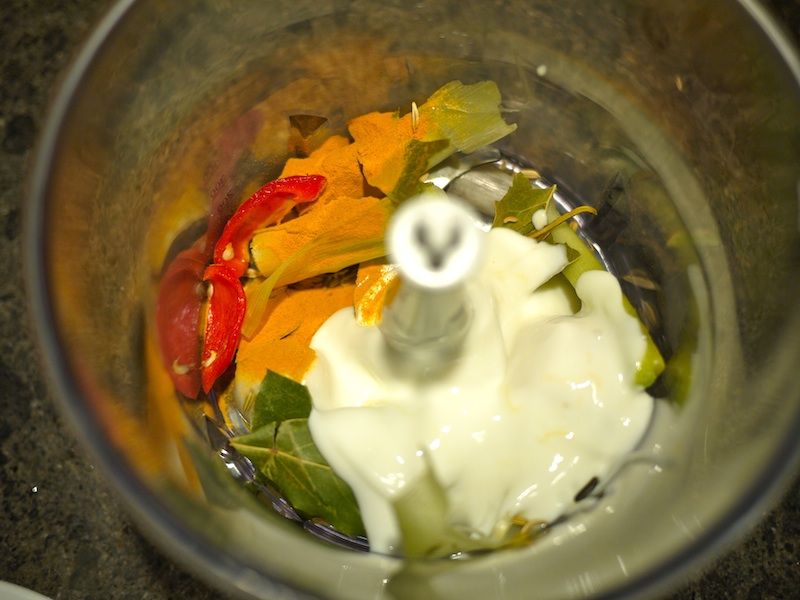 Mettete nel mixer tutte le spezie, la polvere di curcuma, il sale, lo yogurt e un filo di olio. Frullate fin quando avrete ottenuto un composto omogeneo.