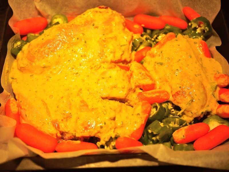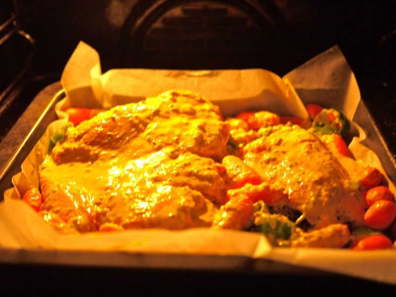 Versate la salsa di yogurt speziata sul maiale e sulle verdure e lasciate marinare per circa 20 minuti a temperatura ambiente, coprendo la teglia con della pellicola trasparente.