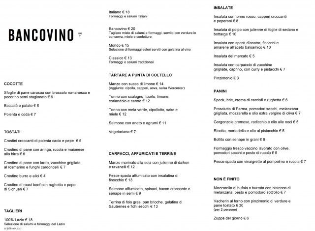 Ma passiamo a quanto più ci interessa: la proposta culinaria. Bancovino non è un ristorante (non ci sono i fornelli), eppure il menu è ricco. La deliziosa Castellani ci tiene a sottolineare che l'offerta dei prodotti andrà a rotazione. Oltre a spaziare tra tartare, anche per vegetariani, carpacci e affumicati di carne e di pesce, insalate e panini (pane rigorosamente fornito dal Panificio Bonci), il menu prova a coprire diverse fasce di prezzo (cocotte e crostini si aggirano sui 7 euro). Prevedibilmente, ad attirare l'attenzione saranno i taglieri, la cui scelta spazia dal 100% laziale alla degustazione di formaggi esteri con gelatina al vino.