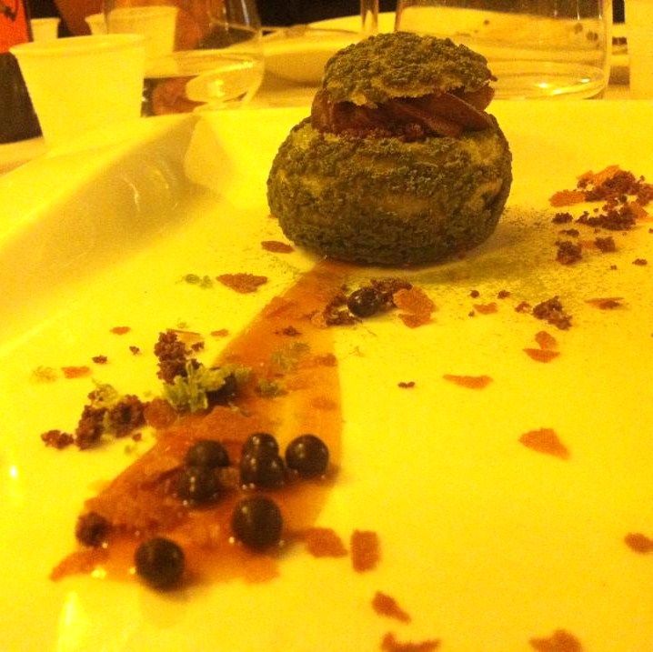 Con grande sorpresa arrivano i dolci al carciofo. Il primo, di Franzin, articolatissimo e dal sapore dolce amaro, è il biscotto di polenta con cappero spolverizzato di caffè, carciofo cotto con cynar, pomodorino candito e ricotta con polvere di liquirizia.