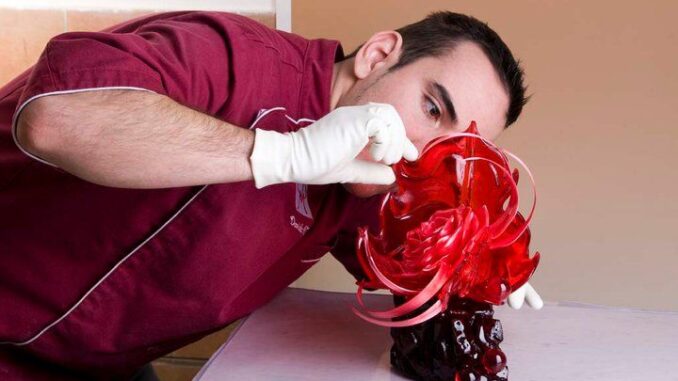 E lei come l’ha imparata? Io vengo da un paese che si chiama Caltagirone, in Sicilia, da una famiglia di ceramisti e pittori, dove la lavorazione della ceramica è all’ordine del giorno. La mia passione artistica un giorno mi fa scoprire in una rivista di dolci l’esistenza anche di questa tecnica: mi sono appassionato e ho cominciato a girare il mondo per impadronirmene. Io nasco come pasticciere, però sono sempre stato appassionato di pittura: avendo questo dono di famiglia lavorare lo zucchero è stato un gioco da ragazzi. Col tempo ho sviluppato una tecnica per lavorare lo zucchero come il vetro di murano soffiato, tirato, colato ugualmente. Posso realizzare personaggi, fiori, oggetti, ambientazioni, tutto. Attualmente siamo in tre al mondo gli artisti ufficiali di zucchero artistico, che hanno una loro scuola: io ne ho una internazionale a Roma.