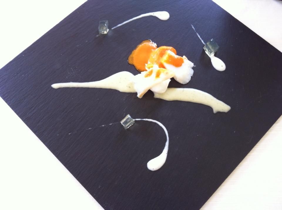 Lo stesso piatto è servito a tavola, ma viene accompagnato da salsa di pomodoro e gelatina dolce di alloro.