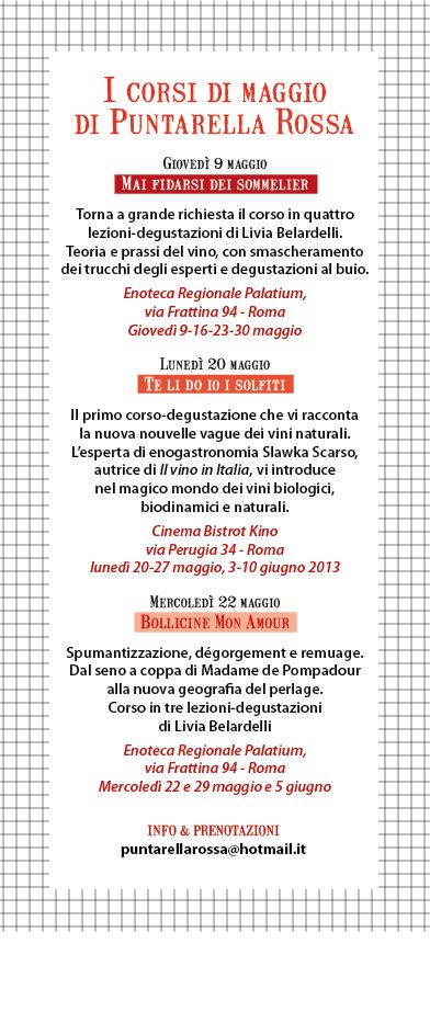 Tutto esaurito e gran successo per il corso di aprile "Mai fidarsi dei sommelier". E allora, viste le richieste, a maggio abbiamo deciso di triplicare. Puntarella Rossa mette in cantiere ben tre corsi-degustazioni: uno di avvicinamento al vino (bis del "Mai fidarsi dei sommelier"), uno tutto dedicato al perlage, "Bollicine mon amour". E, infine, il primo corso completo (con degustazione) dedicato al mondo dei vini naturali, con approfondimenti su biologico e biodinamico: "Te li do io i solfiti". I primi due corsi si terranno all'Enoteca Palatium di via Frattina, a Roma, mentre il terzo sarà al Kino Cinema Bistrot, sempre a Roma. A tutti i corsi parteciperanno produttori di vino ed esperti del settore. Ecco i dettagli e come iscriversi: per info e dubbi potete scrivere a puntarellarossa@hotmail.it. Si comincia!
