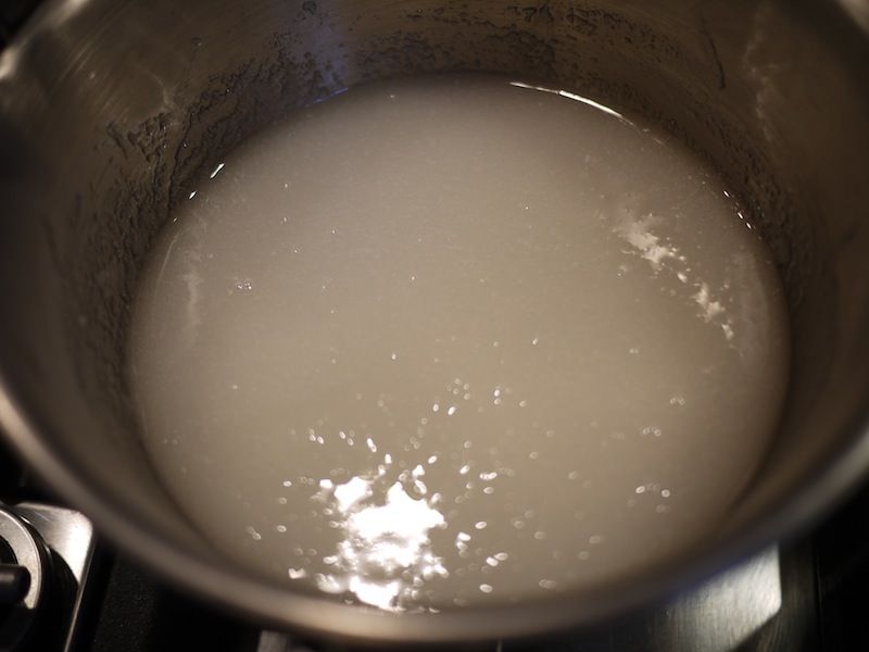 In un pentolino mettete 250 g di zucchero e 50 g d'acqua, rimescolate e portate a ebollizione.