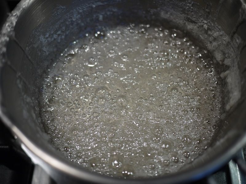 A questo punto chi di voi possiede un termometro a sonda lo usi, lo zucchero fuso dovrà arrivare alla temperatura di 120° C. Se non avete il termometro non disperate, esistono diversi metodi, il primo basato sulla fiducia in chi scrive: dal bollore, su fiamma media, contate 4 minuti.