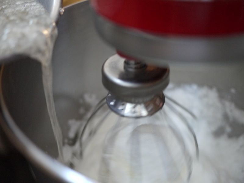 A questo punto aggiungetelo a filo nei bianchi montati a neve sempre continuando a montare fin quando i bianchi non saranno tornati a temperatura ambiente.
