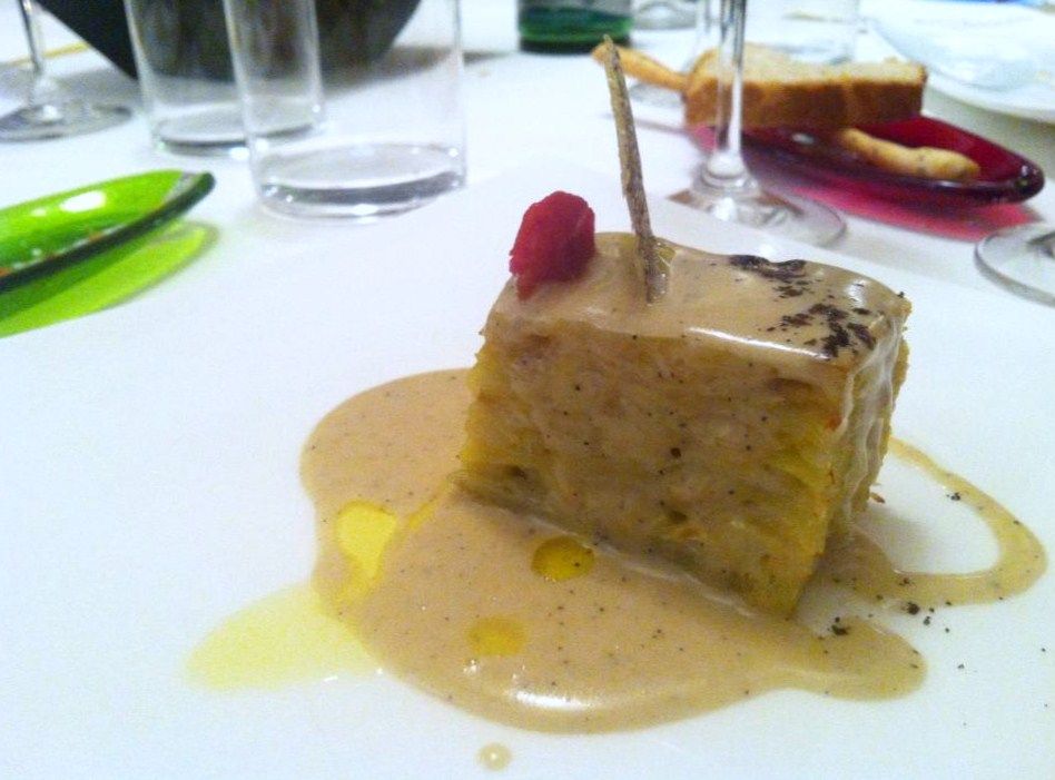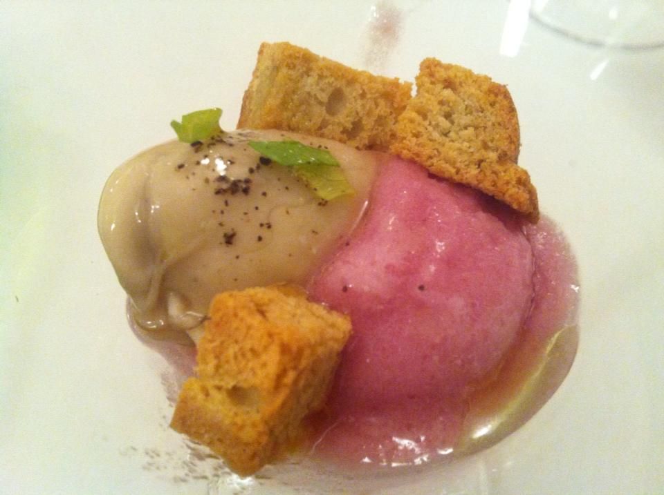 Prima portata: Freddo di cipolla rossa con kstriche e crostini di pane al gorgonzola (foto sopra). Il consiglio dello chef, di temporeggiare al primo boccone per preparare il palato, non convince fino in fondo, per il forte sapore della cipolla, ma l’ostrica è eccezionale e in un boccone fa desiderare di conoscere la proposta successiva.