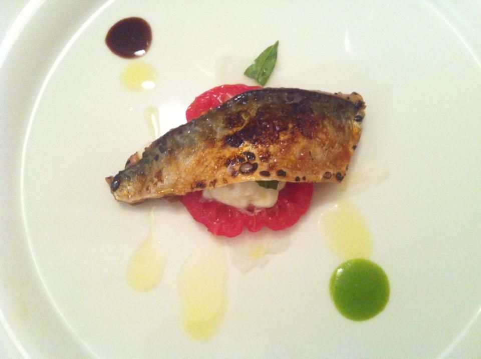 Passiamo al Maccarello bruciato, pomodoro, burrata e daikon. Il pesce è servito con un filo di soia: i sapori sembrano distanti ma il piatto è lucido in un attimo.