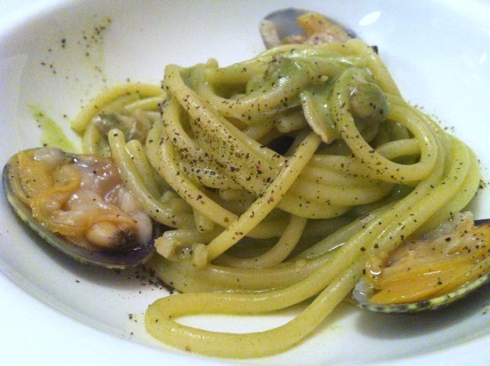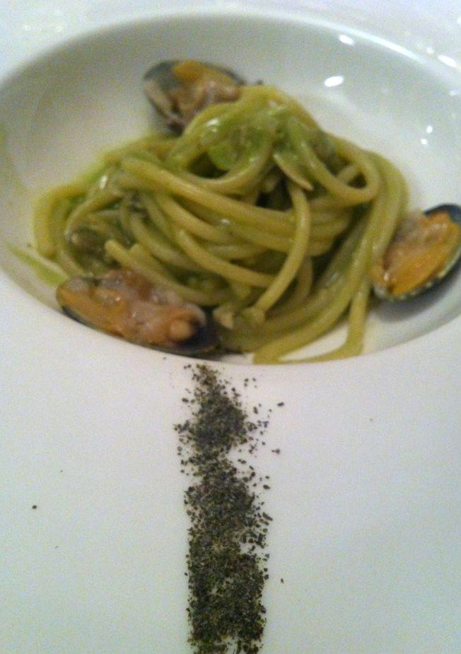 Spaghetti W alle vongole: la prima V sta per vongole veraci, la seconda per vongole jumbo. Servite cotte e crude, possono ammaliare gourmet più e meno esperti. Curiosità: sta al cliente condirli soffiando sulla striscia di polvere di alghe sul cornicione del piatto.