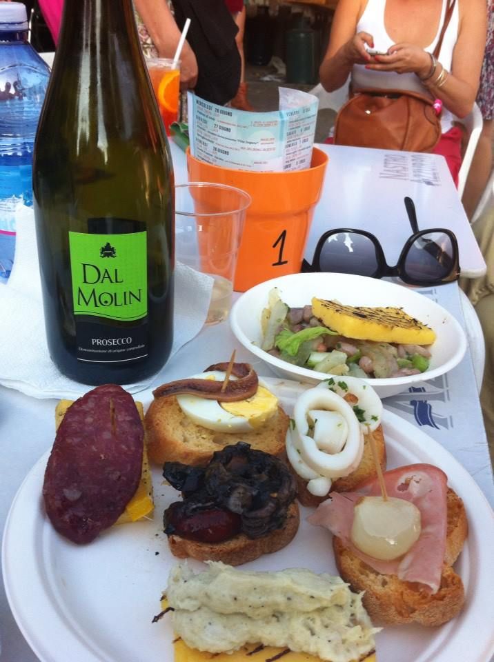 Un piatto di cicchetti veneziani e il prosecco Dal Molin