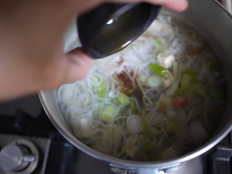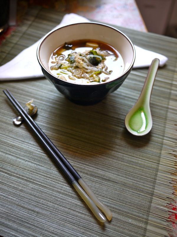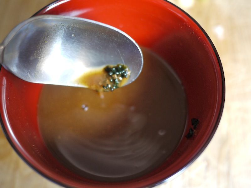 In una tazza, stemperate il miso di riso con un mestolo di brodo caldo; è importante girarlo a lungo, anche con una frusta, per farlo sciogliere per bene, altrimenti rischia di restare ammassato.