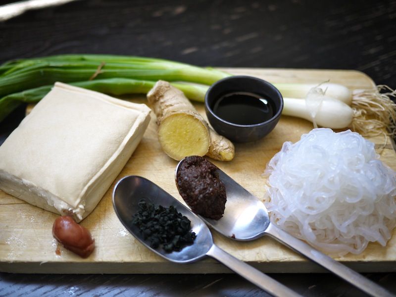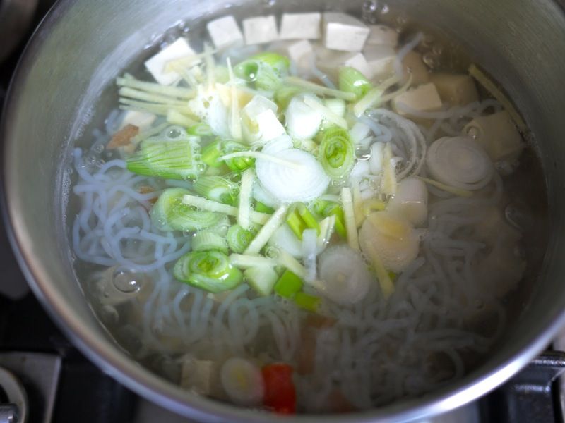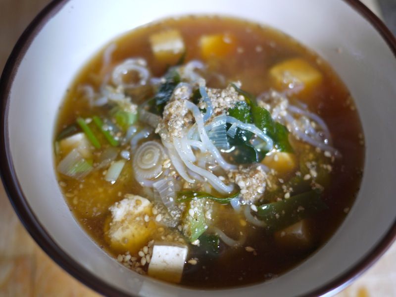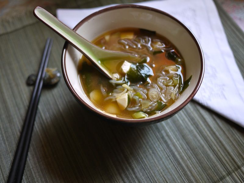 750 cl di acqua; 100 g di tofu; 250 g di spaghetti di konjac; 2 cipollotti; mezzo cucchiaio di miso di riso; mezzo cucchiaio di alga wakame essiccata; 15 g di radice di zenzero; 1 albicocca umeboshi; salsa tamari; gomasio q.b.