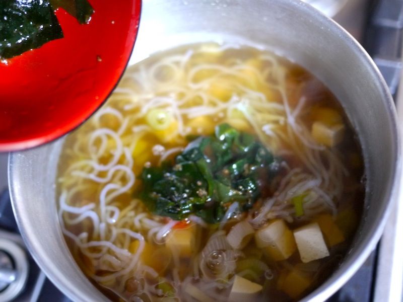 E aggiungete anche la tazza di miso sciolto e le alghe.