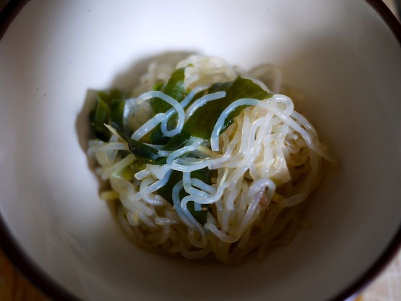 Aggiungete nella stessa tazza anche le alghe wakame essiccate, vi stupirà quanto grandi diventeranno una volta reidratate.