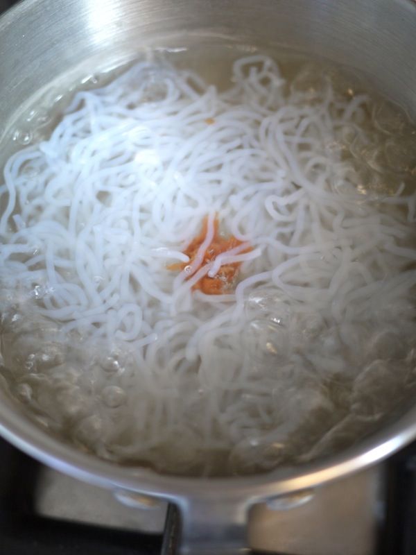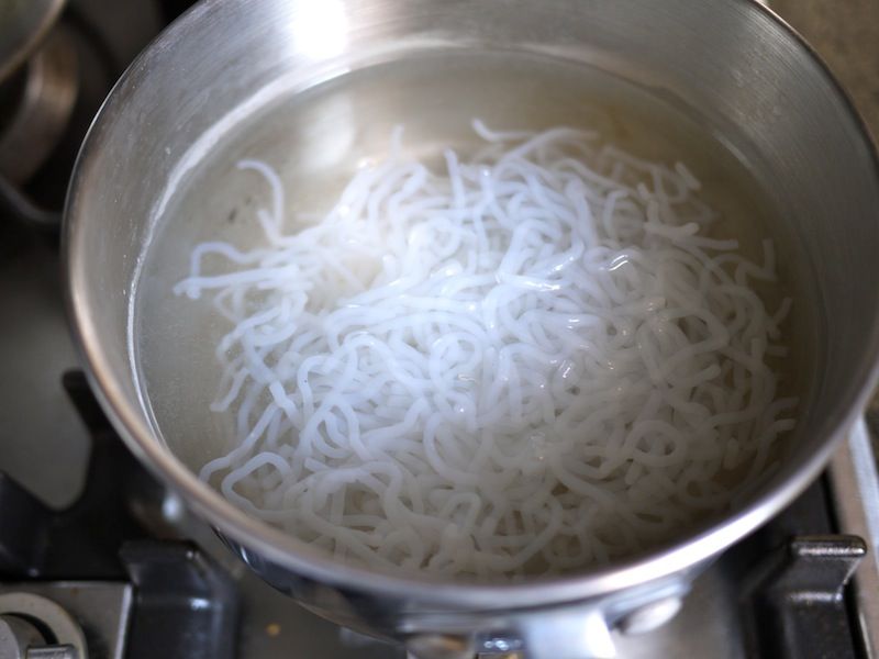 Quando bolle versateci gli spaghetti di konjac e lasciate che cuociano per 5 minuti; non preoccupatevi del tempo, non essendo composti di farina non corrono il rischio di scuocere!