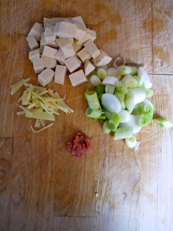 Tagliate il tofu a tocchetti, lo zenzero a fiammiferi sottili e i cipollotti a rondelle.