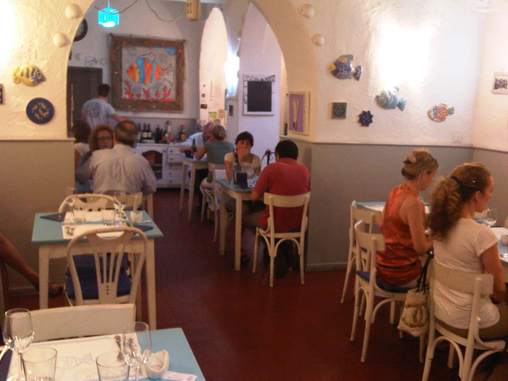 Ecco l'interno, con pesciolini di ogni foggia e specie che navigano nei quadri e nelle ceramiche appese. Tavolini piccoli azzurri, sedie bianche e atmosfera tra Capri e un'isoletta greca.
