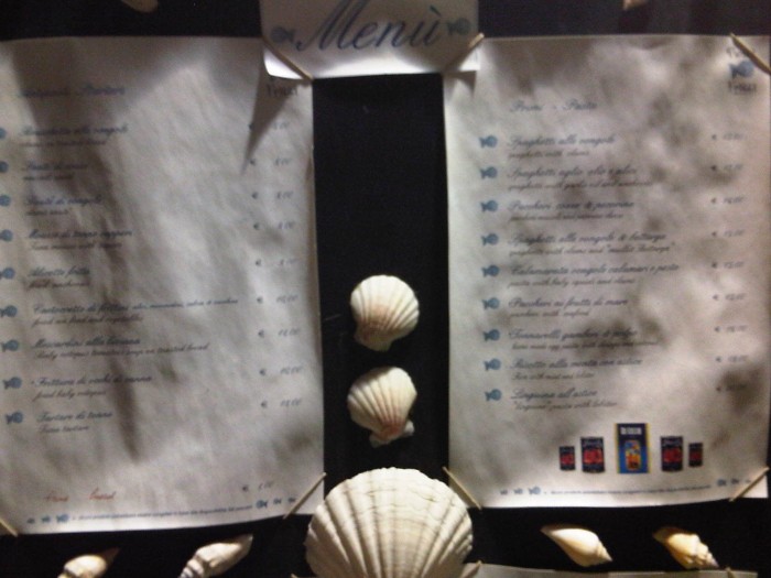 Il menu è tradizionale, senza grandi colpi di scena e senza eccessive arditezze: spaghetti con le vongole (13), paccheri cozze e pecorino (14 euro), calamarata vongole calamari e pesto (15), tonnarelli gamberi e polpo (16), risotto alla menta con astice (19). Tra i secondi troviamo filetto di pezzogna all'Amalfitana (19), astice alla catalana (20), pesce spada alla siciliana (18).