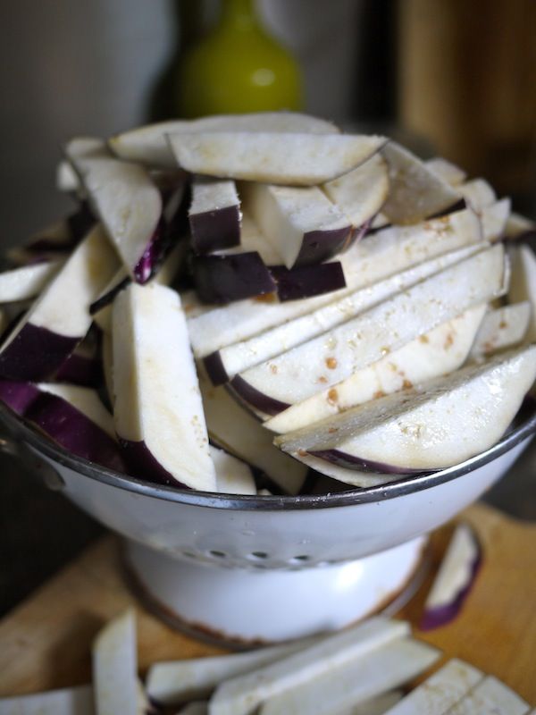 Man mano che tagliate le melanzane, mettetele a drenare in uno scolapasta con una presa di sale per eliminare parte della loro acqua di vegetazione e assicurarvi una melanzana dolce e succosa. Nel mentre che le melanzane drenano (saranno sufficienti 20 minuti), portate a ebollizione un litro e mezzo di acqua con 500 g di aceto di vino bianco.